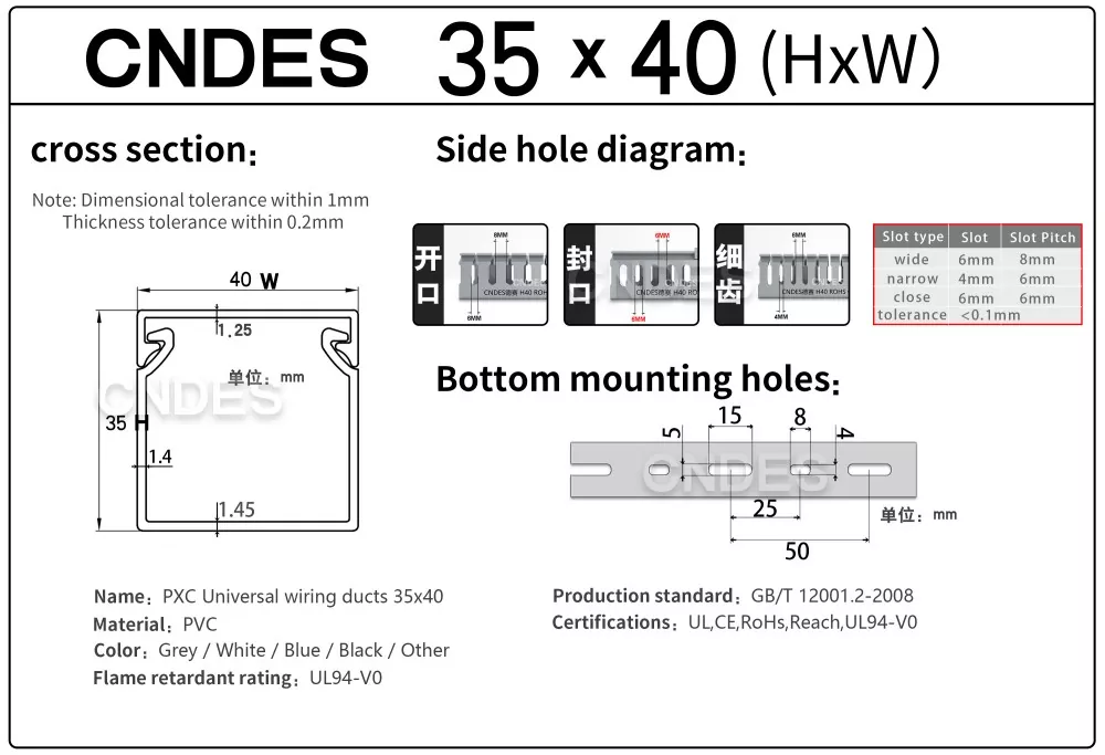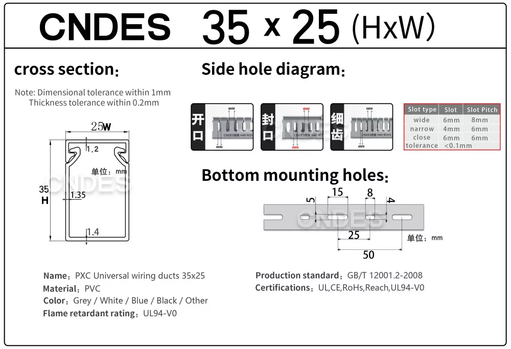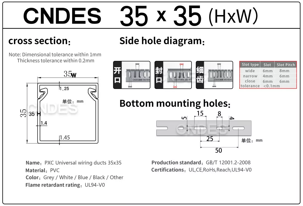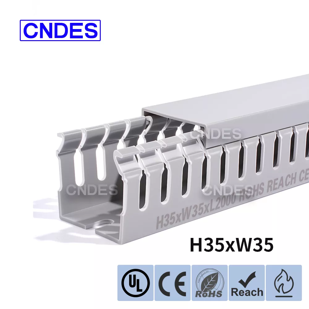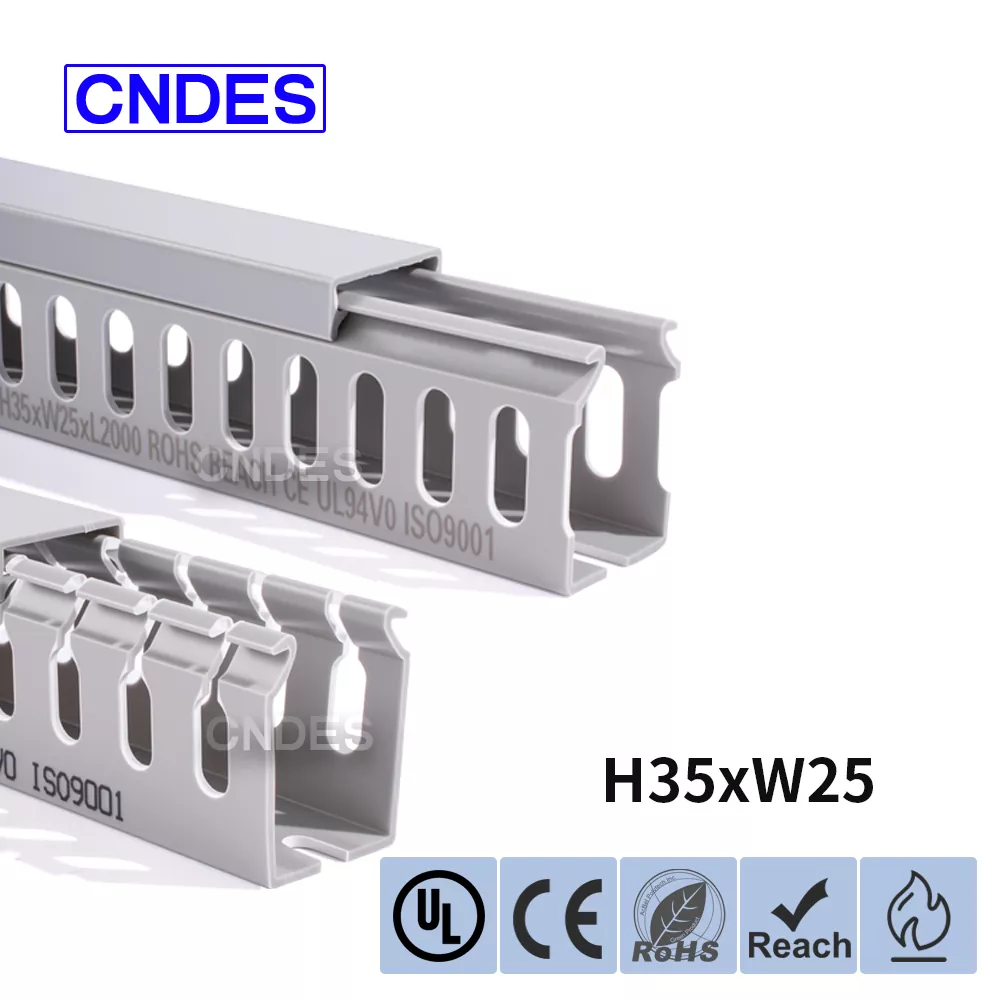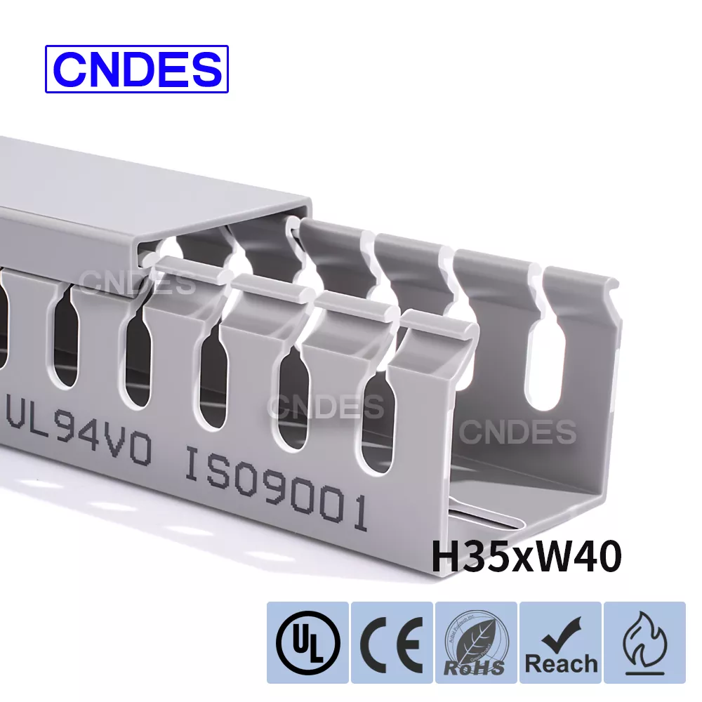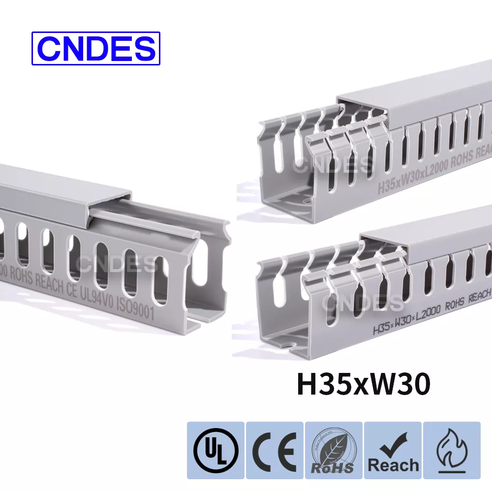 Selaras 35mm Dhuwur Slotted PVC Wire Routing Duct, diprodhuksi dening perusahaan China CNDES, kasusun saka basis PVC kaku lan tutup dipindhah. Dasar kasebut nduweni alur sing padha karo driji sing dicap ing loro-lorone, mbentuk "untu sisir." Untu iki bisa rusak nganggo tangan, saéngga kabel metu kanthi horisontal saka posisi apa wae. Tutup kasebut gampang dipasang maneh, njaga tampilan sing rapi. Baris bolongan dipasang ing sisih ngisor cocog karo jarak standar DIN 43659. Bisa cepet diamanake menyang panel, pigura kabinet, utawa struktur sing padha nggunakake sekrup utawa rivet M5.