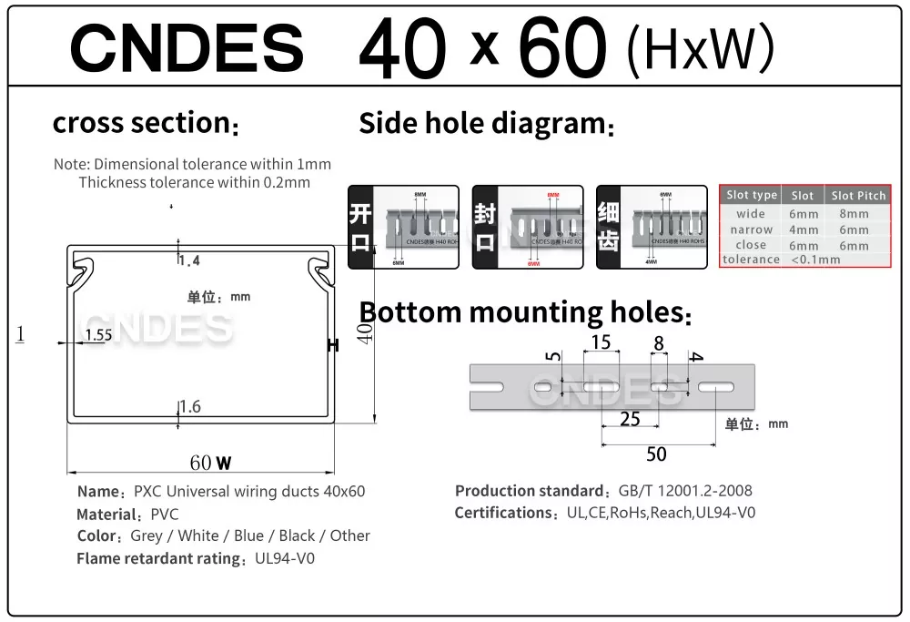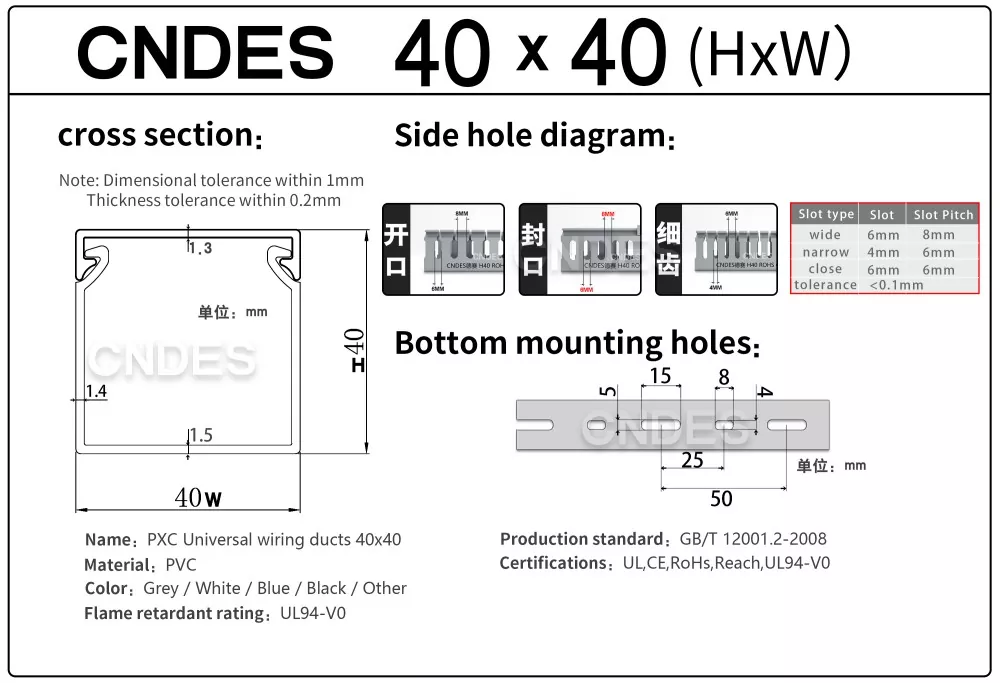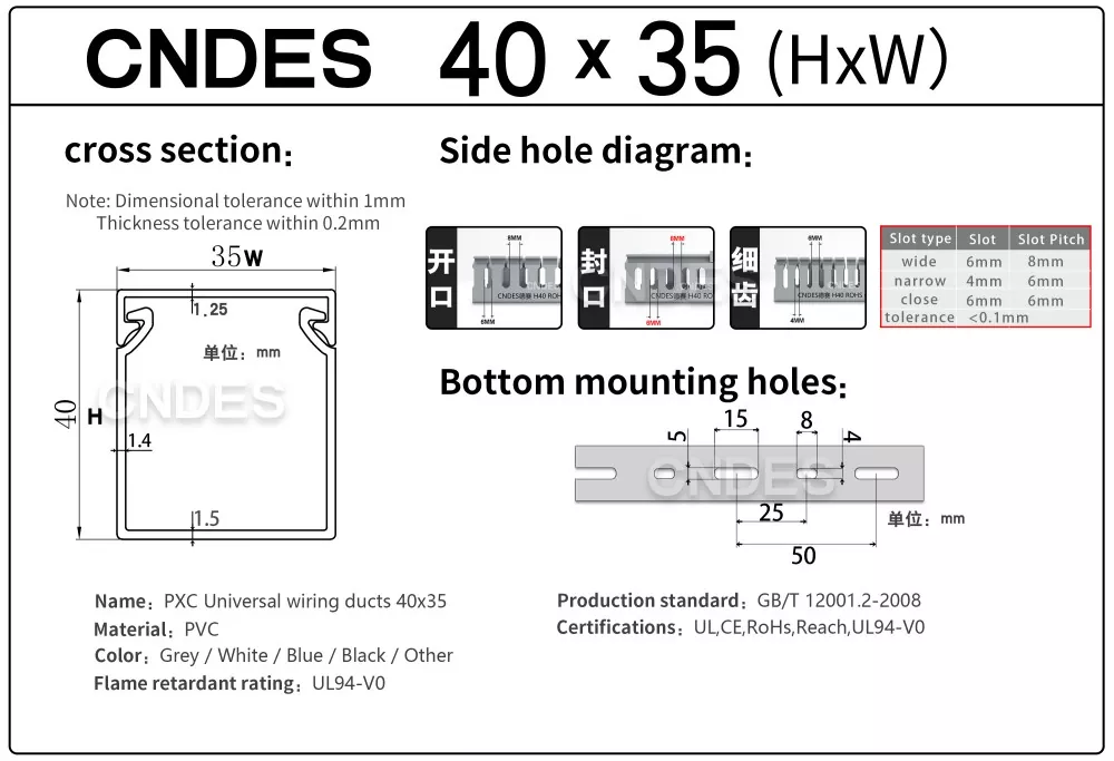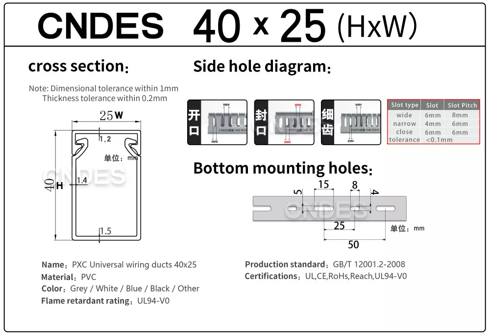 CNDES minangka produsen & pemasok Saluran Kabel PVC Slotted Utama. Ing kene kita bakal ngenalake tray kabel sing dhuwuré 40mm, kalebu 40 * 25, 40 * 30, 40 * 35, 40 * 40, lan 40 * 60.