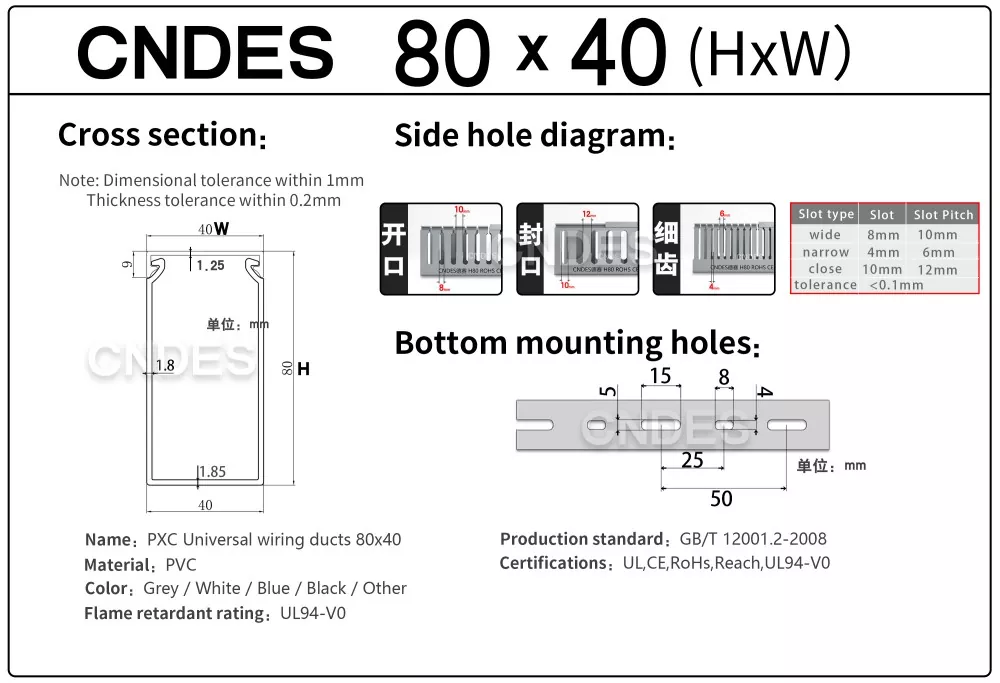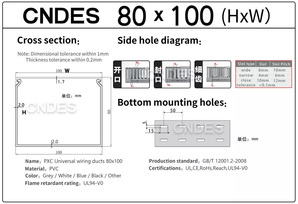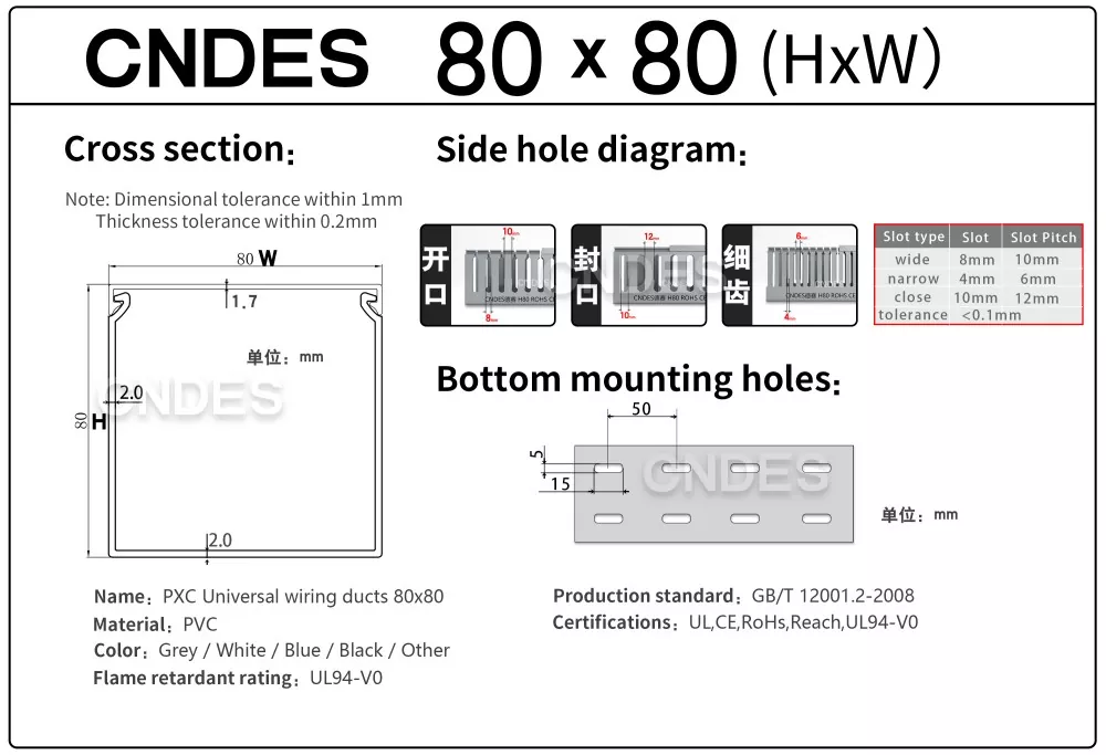 Quality Assurance: Kabeh High-Performance 80 Dhuwur Slotted PVC Automation Cable Ducts disertifikasi miturut UL, RoHS, REACH, ISO, CE, lan standar liyane, nyukupi syarat lingkungan lan safety. Kanggo masalah kualitas (contone, retak, deformasi), supplier nyedhiyakake layanan bali / ijol-ijolan.