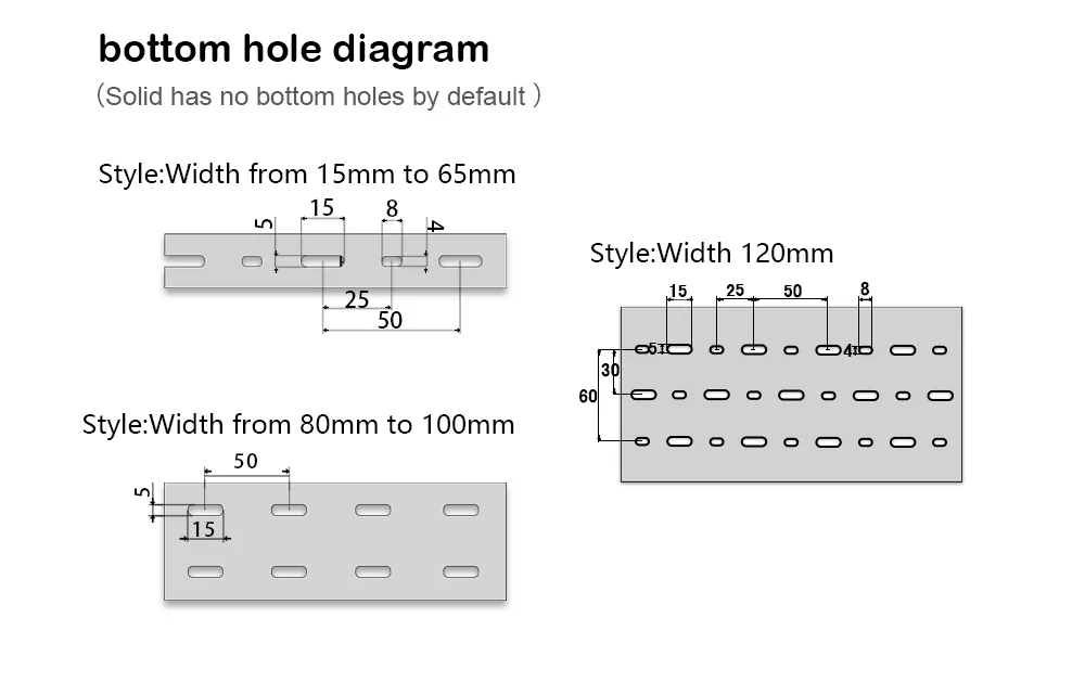 Spesifikasi tray kabel kasebut minangka dhuwur * jembar, kanthi unit kasebut mm. Pisanan, nemtokake ukuran tray kabel sing dibutuhake, kayata dhuwure 80mm lan ambane 40mm. Banjur, pilih ambane bolongan stopkontak adhedhasar kekandelan kabel, salah siji untu sudhut (8mm) utawa untu alus (4mm). Disaranake kabel nyata ora ngluwihi 70% saka papan tray.